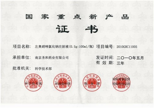2010國(guó)家重點(diǎn)新產(chǎn)品證書(shū)—左奧硝唑