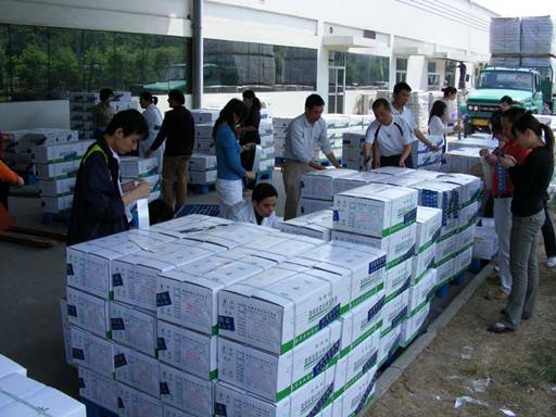 圖為公司員工加緊裝載賑災(zāi)藥品