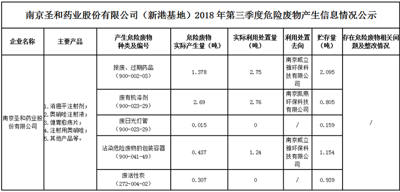 南京圣和藥業(yè)股份有限公司(新港基地)2018年第三季度危險廢物產生信息情況公示