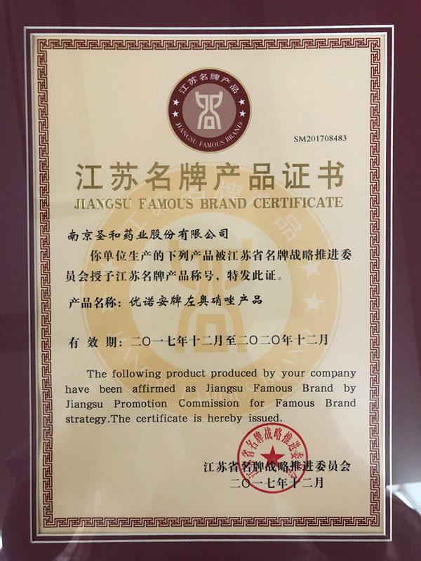 2017年優(yōu)諾安江蘇名牌產(chǎn)品證書