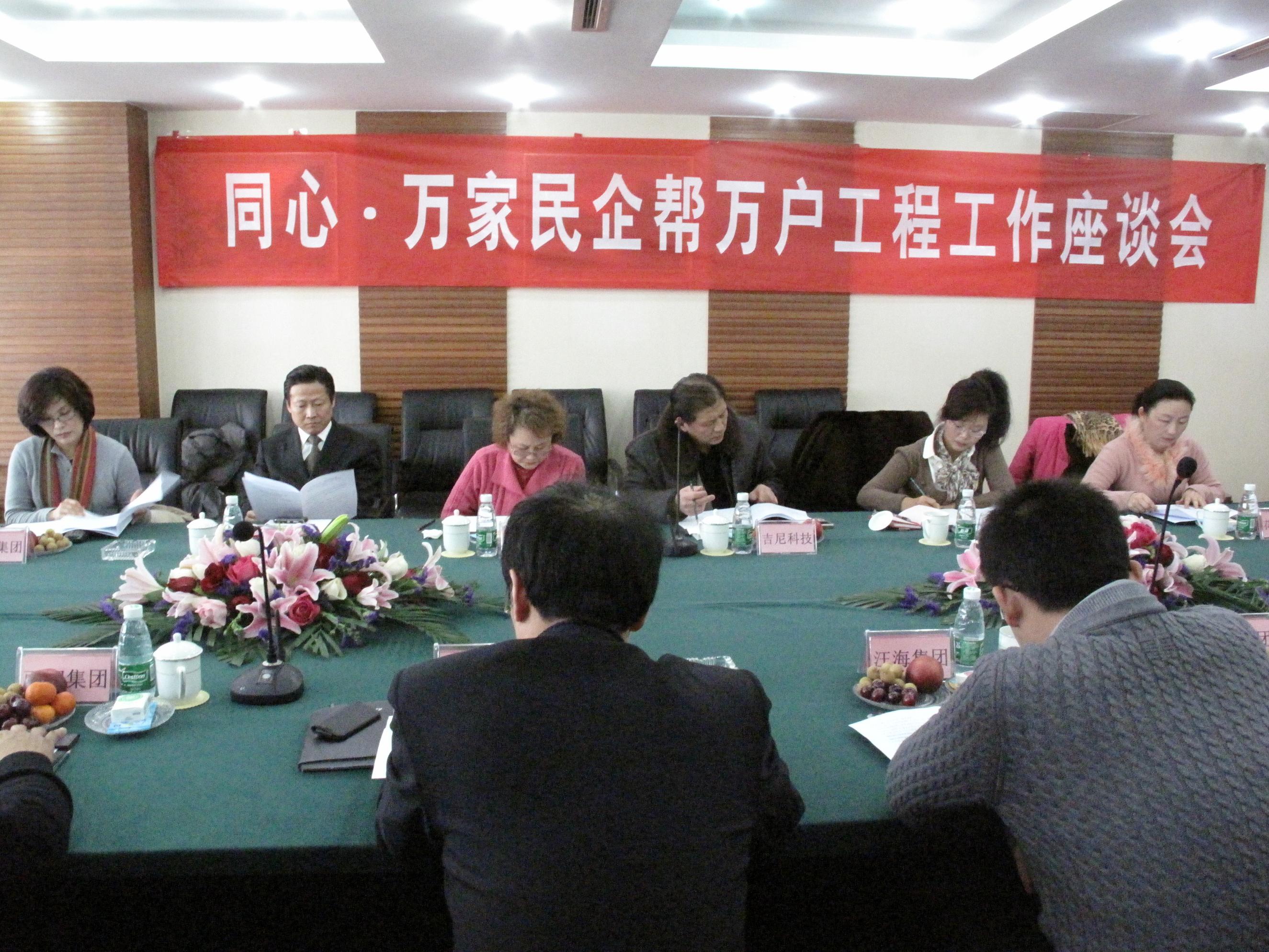 本網(wǎng)訊 為充分發(fā)揮非公有制企業(yè)在南京市幸福都市建設(shè)和率先基本實現(xiàn)現(xiàn)代化中的積極作用,全市統(tǒng)一戰(zhàn)線將組織萬家非公有制企業(yè)幫扶萬戶特困家庭,開展“同心·萬家民企幫萬戶工程”活動。2月7日,南京市委統(tǒng)戰(zhàn)部“同心·萬家民企幫萬戶工程”工作座談會在圣和集團總部召開。南京市工商聯(lián)副主席李冰、南京市委統(tǒng)戰(zhàn)部經(jīng)濟處處長鄭德巍、南京市工商業(yè)聯(lián)合會經(jīng)濟處處長錢衛(wèi)冰,以及雨潤集團、圣和集團、商貿(mào)集團、汪海集團、晨林商貿(mào)、飛元集團、易記小吃店、吉尼科技、新葉時裝、花旗涂料等企業(yè)負責(zé)人參加會議。