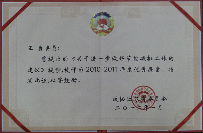 為鼓勵(lì)先進(jìn),不斷增強(qiáng)政協(xié)履行職能的實(shí)效,日前,經(jīng)省政協(xié)十四屆四十六次主席會(huì)議審議,政協(xié)江蘇省委員會(huì)表彰出72件優(yōu)秀提案和25篇優(yōu)秀視察調(diào)研報(bào)告。王勇董事長作為省政協(xié)委員,提出的《關(guān)于進(jìn)一步做好節(jié)能減排工作的建議》提案,被表彰為2010-2011年度優(yōu)秀提案。