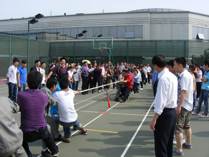 4月28日下午,位于制藥廠內(nèi)的籃球場上人聲鼎沸、熱鬧非凡,參加拔河比賽參賽隊員、啦啦隊員及工作人員早早來到了場地。15點整,隨著裁判的哨聲一響,參賽隊員都全身心地投入到比賽中去。隊員們緊緊抓牢手中的繩子,降低重心,齊心協(xié)力,卯足了勁往后拉。每名隊員都是竭盡全力,摔倒了,再爬起來,手磨破了,咬咬牙繼續(xù)堅持著?!凹佑?!加油!”場邊拉拉隊員們的加油聲、歡呼聲響徹整個籃球場的上空,此起彼伏,現(xiàn)場氣氛十分熱烈。