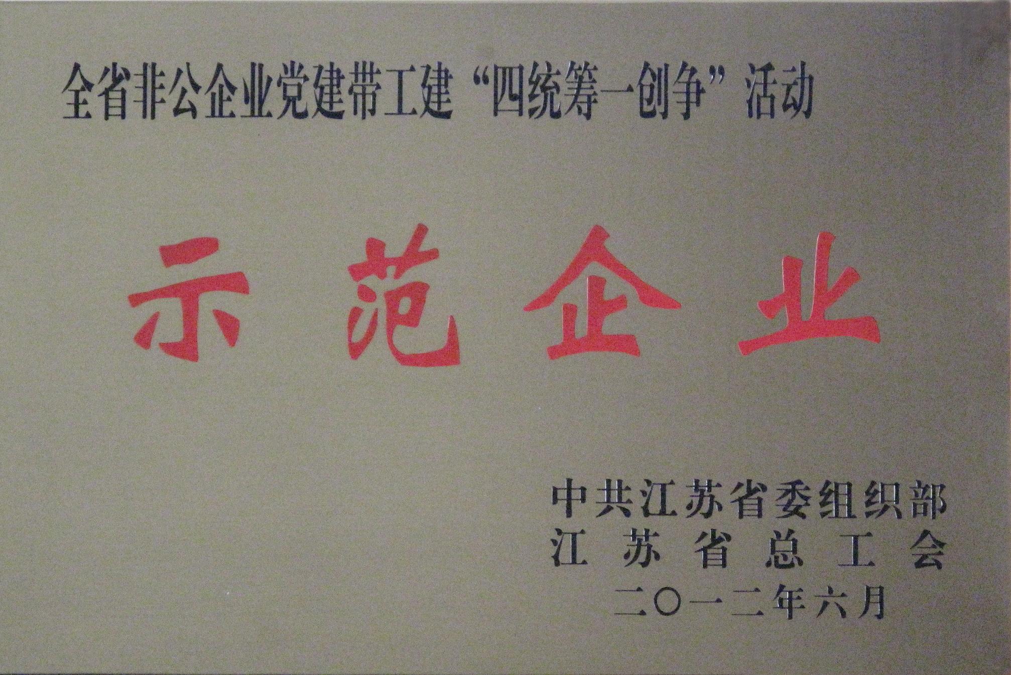 本網(wǎng)訊 6月21日下午,江蘇省黨建帶工建“四統(tǒng)籌一創(chuàng)爭(zhēng)”活動(dòng)示范企業(yè)示范片區(qū)集中授牌儀式在南京舉行。會(huì)上,江蘇省委組織部、省總工會(huì)向首批300家示范企業(yè)和30個(gè)示范片區(qū)授牌,我公司被命名為“全省黨建帶工建”四統(tǒng)籌一創(chuàng)爭(zhēng)“活動(dòng)示范企業(yè)”。集團(tuán)黨總支書記、工會(huì)主席戚良猛同志出席授牌儀式。