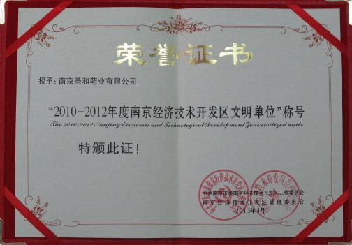 近日,南京經(jīng)濟技術開發(fā)區(qū)下發(fā)《關于表彰2010-2012年度南京經(jīng)濟技術開發(fā)區(qū)文明單位的決定》,授予南京圣和藥業(yè)有限公司“2010-2012年度南京經(jīng)濟技術開發(fā)區(qū)文明單位”榮譽稱號并頒發(fā)證書。