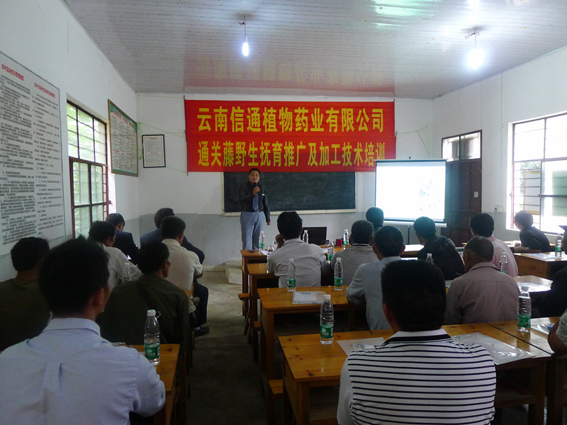 會議由生產(chǎn)技術部經(jīng)理王平理主持。會上,植物藥業(yè)副總經(jīng)理孫新平向與會人員介紹了公司情況及發(fā)展規(guī)劃;馬關縣科協(xié)主席發(fā)表講話,對培訓會給予高度評價,號召農(nóng)戶與公司積極配合,做到互惠互利,合作共贏。隨后,生產(chǎn)技術部高級技術員趙光榮就通關藤的種苗移栽和采收方法向大家進行了圖文并茂地講解。在現(xiàn)場,對農(nóng)戶最關心的問題進行說明和交流,解答了農(nóng)戶的疑問;通過有獎競答,向參會人員送出了印有公司標志的禮品,讓廣大農(nóng)戶對通關藤種苗移栽和采收方法的細節(jié)爛熟于心,保證了培訓效果。