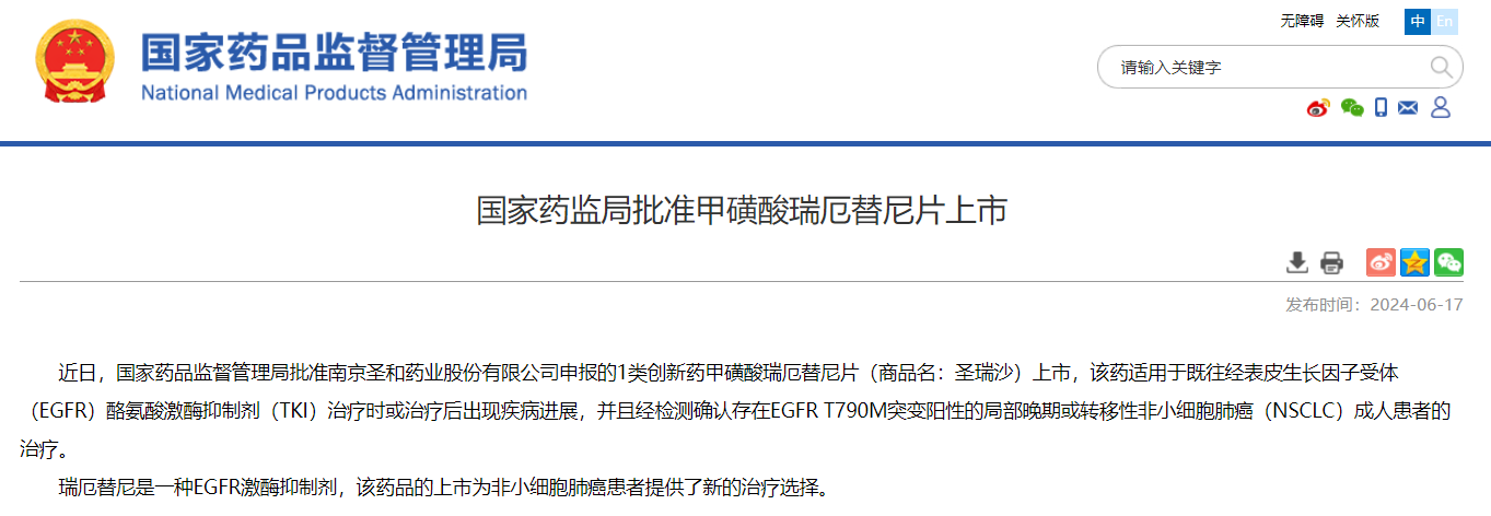 2024年06月17日,國家藥品監(jiān)督管理局(NMPA)官方網(wǎng)站公示,南京圣和藥業(yè)股份有限公司自主...